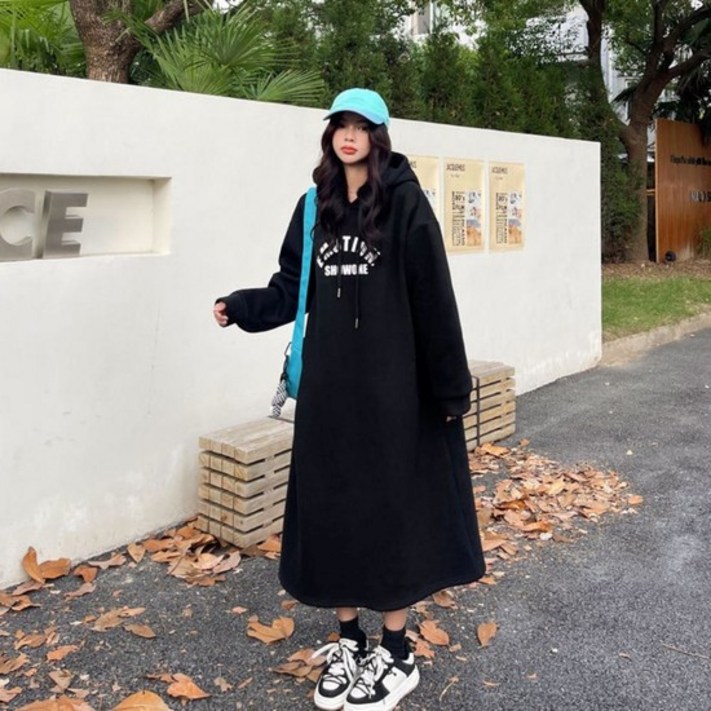 겨울 따뜻한 여성 기모 영문 프린팅 롱 후드 원피스