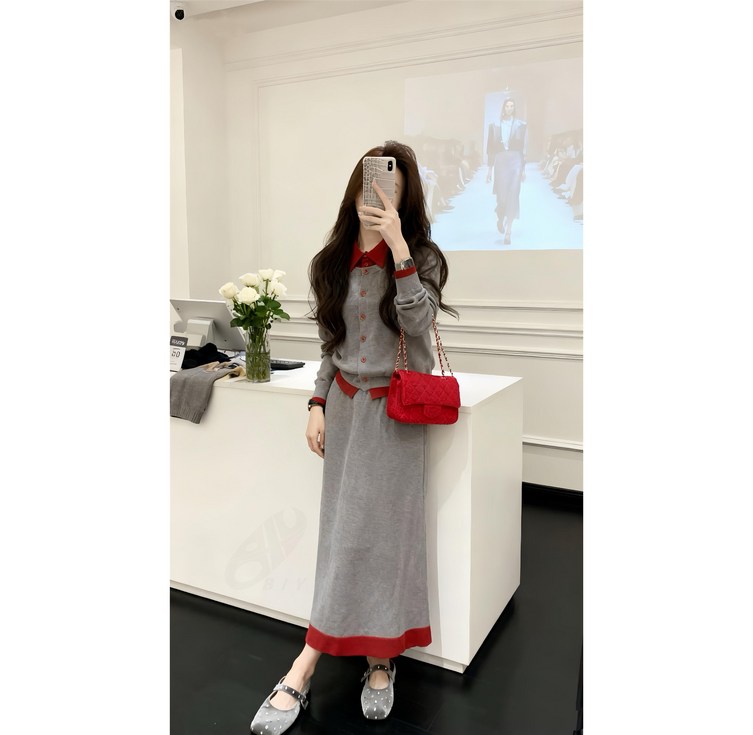 비아이와이 여성 봄 가을 심플 데일리 가디건 스커트 투피스 세트 D89