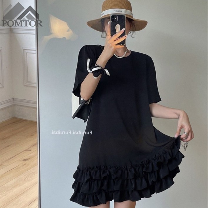 POMTOR 여성 반팔 루즈핏 미니 프릴 티셔츠 원피스L4XL