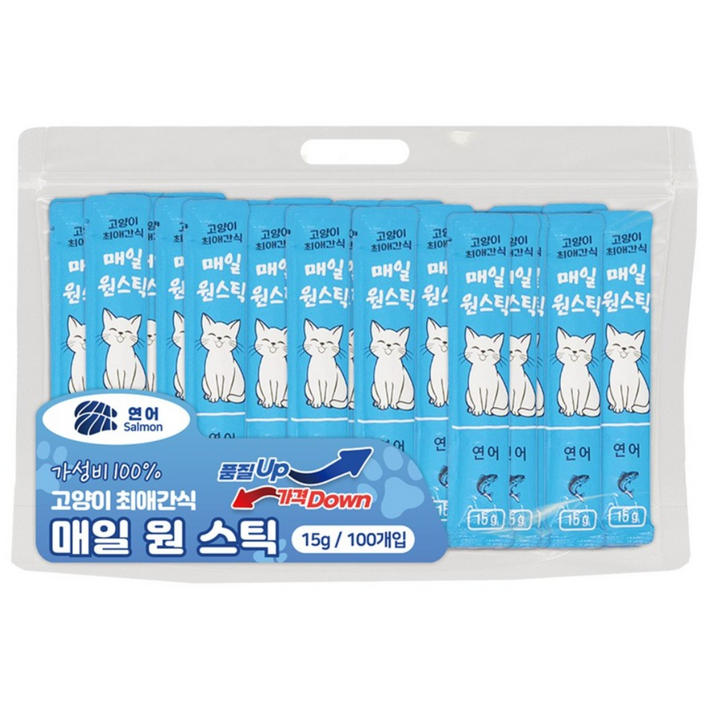 고양이 매일 원스틱 츄르 간식 짜먹는 스틱 저렴한 대용량 100p 가성비 길고양이 습식 영양간식, 연어, 15g, 100개