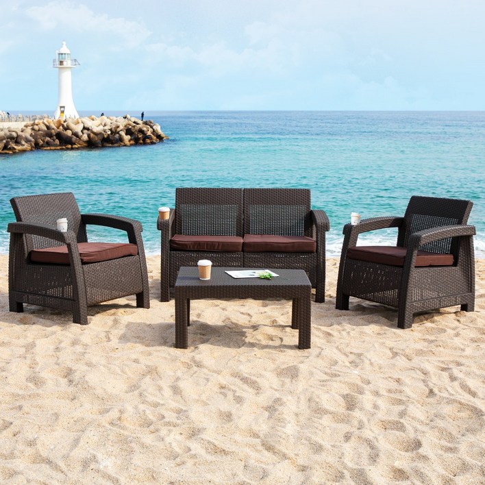 브릭스 4인 야외 라탄 테이블 소파 세트 정원 카페, 브라운, 일반 2 벤치 1